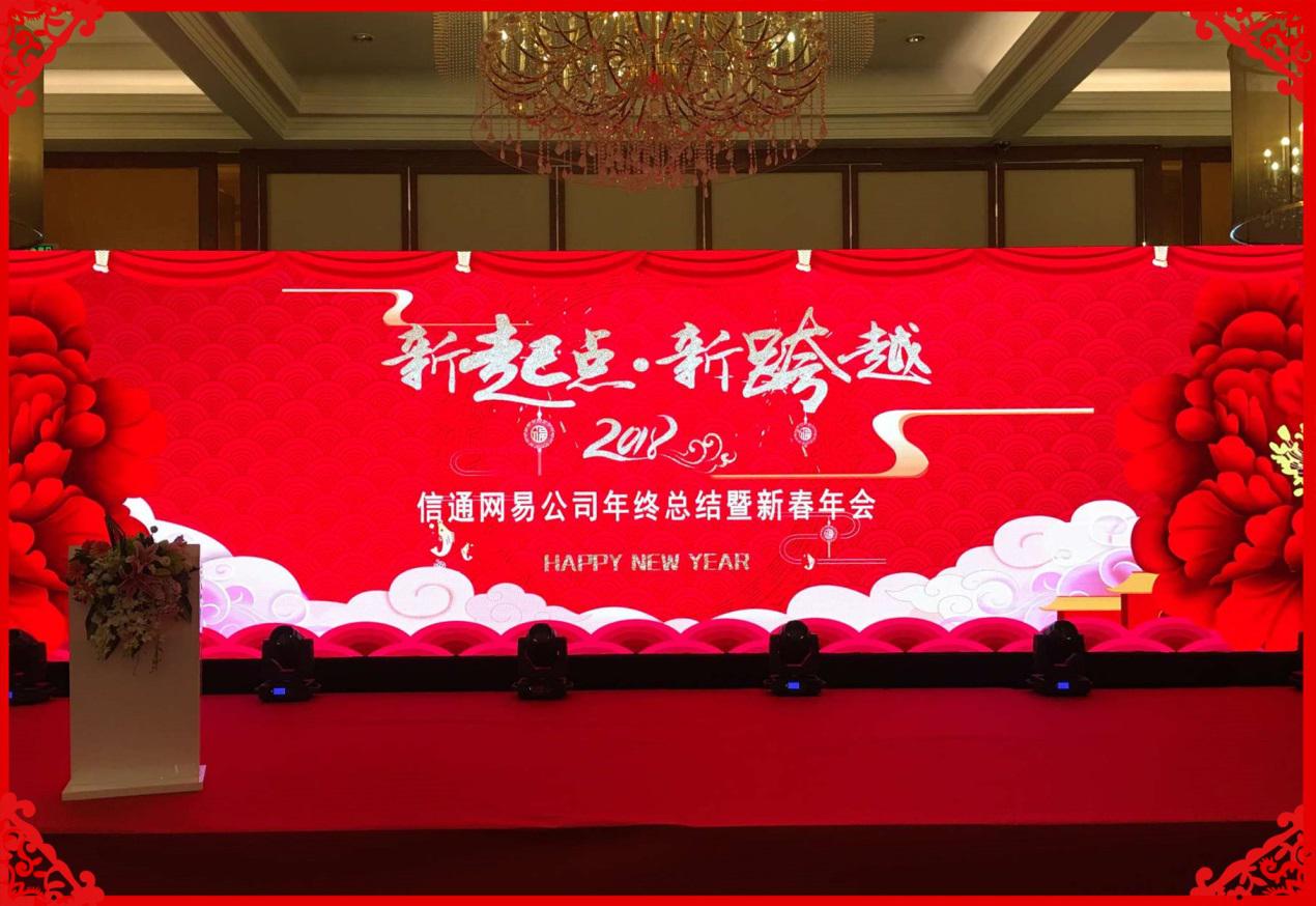 2018年2月9日,信通全体同仁及家人在世纪城国际会议中心欢聚一堂,喜迎新春。在欢快的迎宾曲中,公司同仁以部门为单位,走过红毯,合影留念,落座等待会议开始。主持人在振奋人心的音乐中入场,述说公司发展历程,展望美好未来。