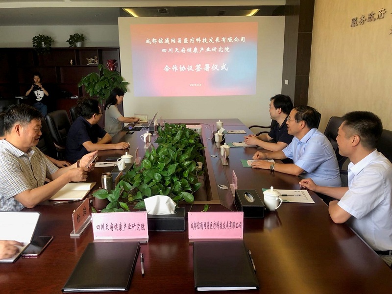2019年8月9日,信通网易与天府健康产业研究院顺利签署了合作协议。我公司总经理易刚晓、研究院院长郑小华出席了此次签署仪式,同时出席的还有研究院常务副院长王敬华、研究院首席专家甘华平、研究员易昜以及我司技术总监代术成、副总经理彭朝海等。