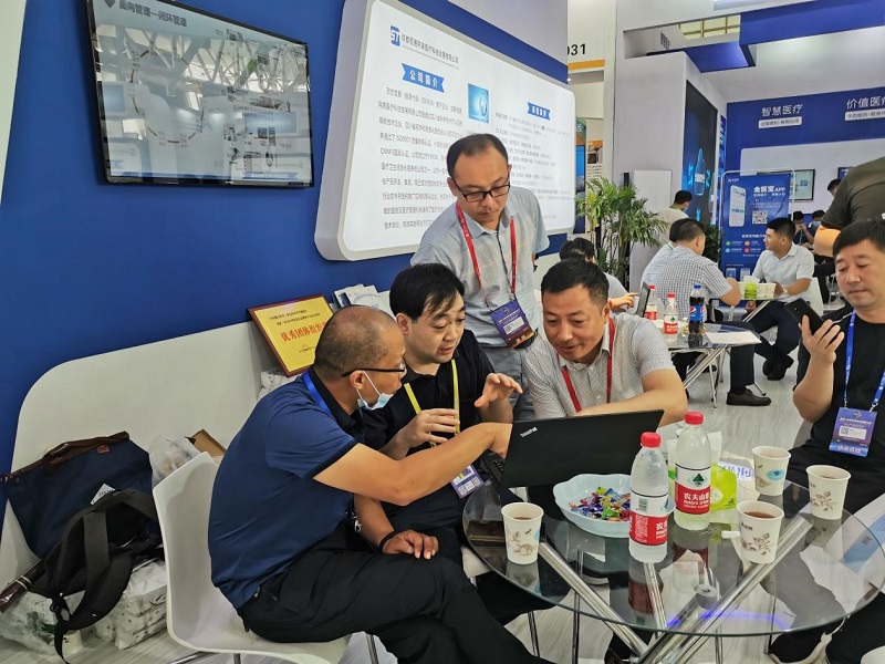 ▲河南省卫健委信息化副处长胡光辉、河南省卫健委统计信息中心科长朱国重、许昌市卫健委信息中心科长李宗辉到访展台进行交流