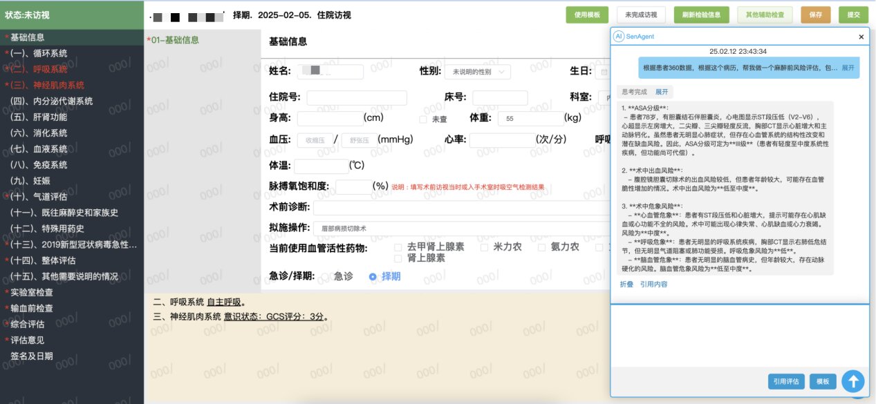 SenAgent能快速获取并高效自动分析多源患者信息,减少信息遗漏和个人主观判断,帮助麻醉医生快速获取并全面处理所需的决策信息,在实现麻醉临床决策并提高工作效率的同时,保证同质化评估水平。